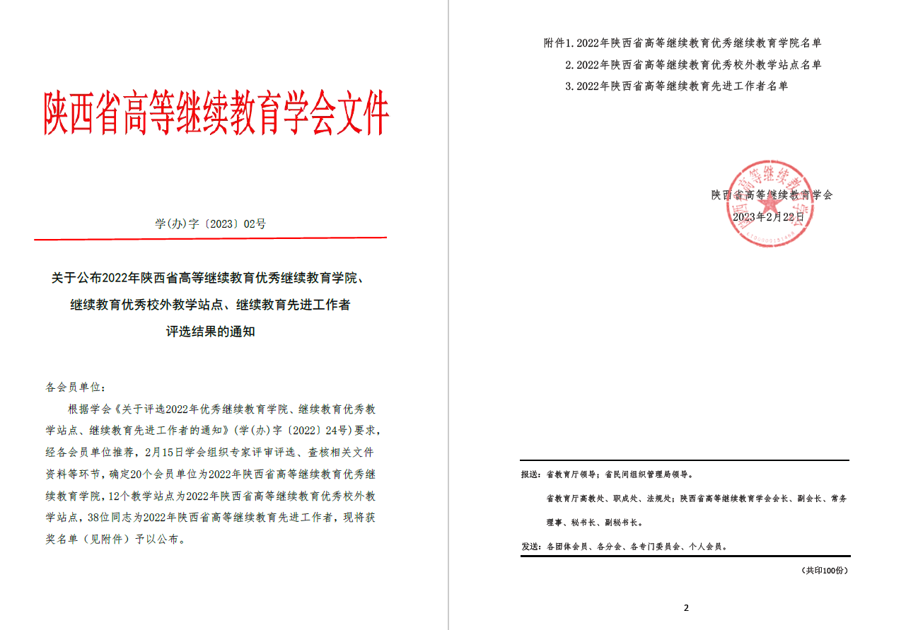 2023年2月23日,陕西省高等继续教育学会发布《关于公布2022年陕西省高等继续教育优秀2026年世界杯官网、继续教育优秀校外教学点、继续教育先进工作者评选结果的通知》,公司2026年世界杯官网荣获2022年陕西省高等继续教育优秀公司,惠震获2022年陕西省高等继续教育先进工作者。