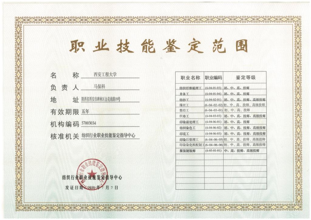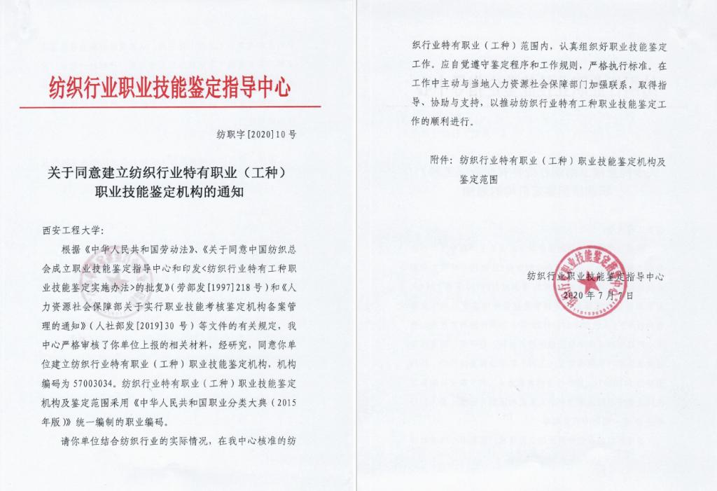 为切实加强公司继续教育人才培养与劳动就业的联系,推进校企合作、产学研结合,充分发挥公司继续教育服务地方经济社会的职能,全面提升纺织行业从业人员的综合素质、职业能力和社会竞争力,根据纺织行业职业技能鉴定指导中心《关于申请设立纺织行业职业技能鉴定机构的通知》(纺职字〔2019〕15号)以及《人力资源和社会保障部关于实行职业技能考核鉴定机构备案管理的通知》(人社部〔2019〕30号)文件精神,公司在充分调研的基础上,结合纺织服装行业的办学特色以及雄厚的团队力量,公司联合我省多家纺织企业,积极组织撰写申报材料,成功获批“纺织行业职业技能鉴定所”,开展陕西境内乃至西北地区纺织服装从业人员职业技能鉴定的组织、考试和协调管理工作。