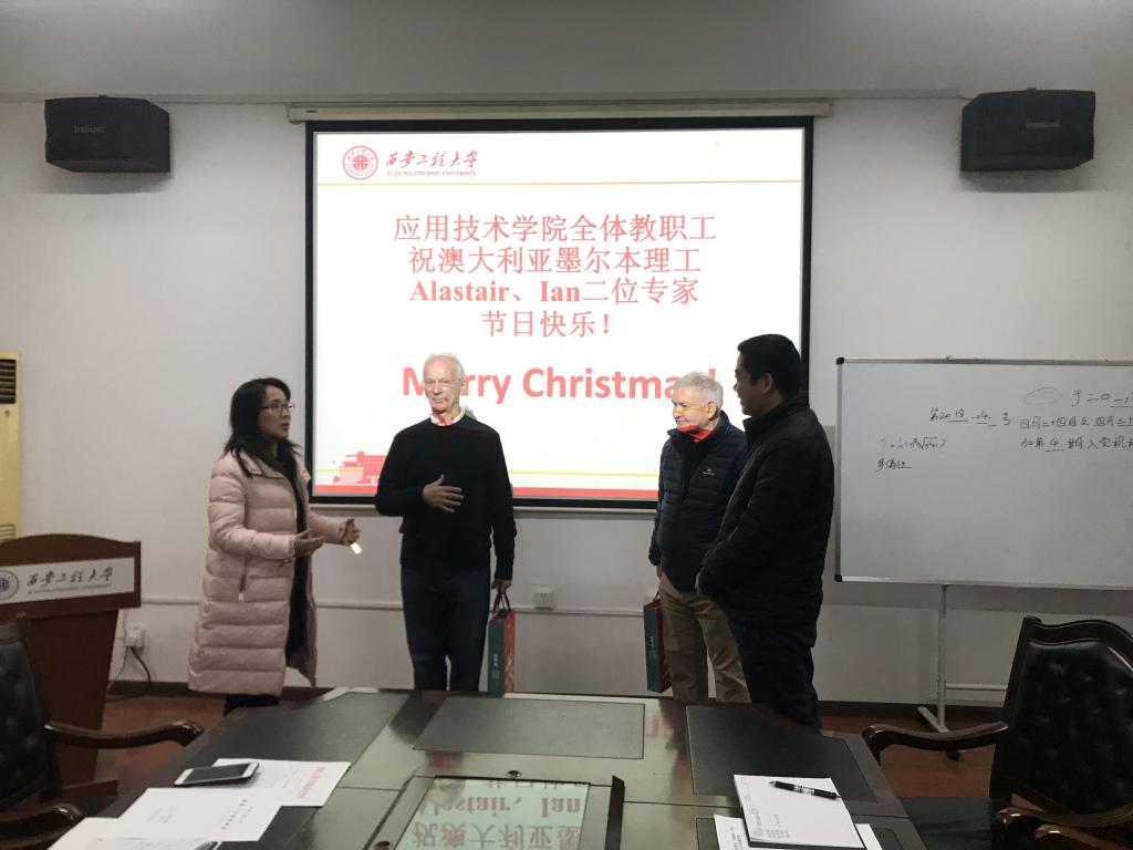 12月25日上午,2026年世界杯官网副经理刘玉森和公司教务科、教研室相关老师一起走访慰问了正在公司承担中澳合作办学项目专业课教学的澳大利亚墨尔本理工公司Alastair、Ian两位外籍教师,代表公司向他们送上节日的祝福。
